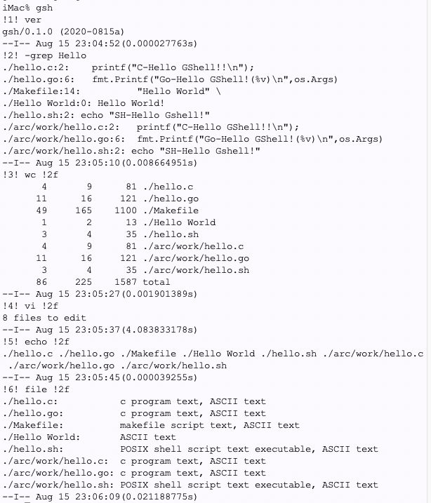 開発:機能そのものはすぐに出来たのですが、ユーザにそれをどう引用してもらうかが問題でした。結果にユーザが名前を付けるのも良いのですが、ちょっとかったるい。で考えたのは、N番目のコマンドの実行の結果得られたファイルのリストを !Nf というふうに参照する、というものです。こんな感じです。