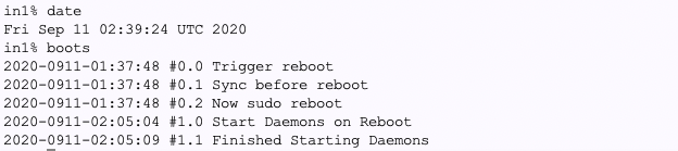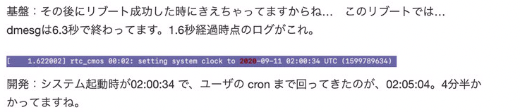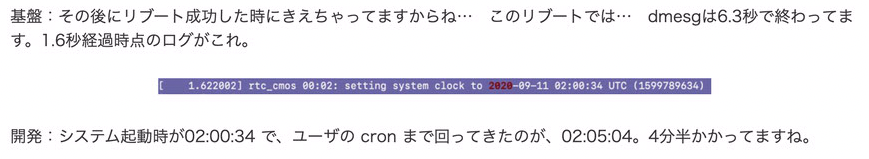 基盤:それで、先ほどのリブートの件、ブートのログを見ると、外から繋げなくなってただけでなくて、実際に立ち上がって無かったようです。少なくとも、ユーザのcronが実行されるフェーズまでは至ってません。