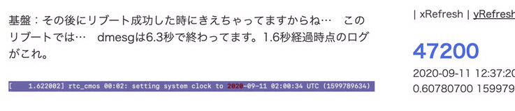 基盤:その後にリブート成功した時にきえちゃってますからね… このリブートでは… dmesgは6.3秒で終わってます。1.6秒経過時点のログがこれ。