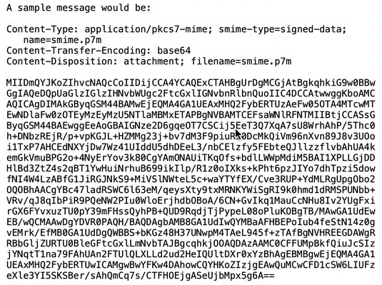 開発:そうですね・・・ S/MIME… RFC... おや、最近は CMS (Cryptographic Message Syntax) って呼ぶんですかね。どういう関係なのやら。えーと、S/MIME の最新の規格はv4.0、RFC8551のようです。2019年4月発行。メッセージの見た目はこんな感じ。