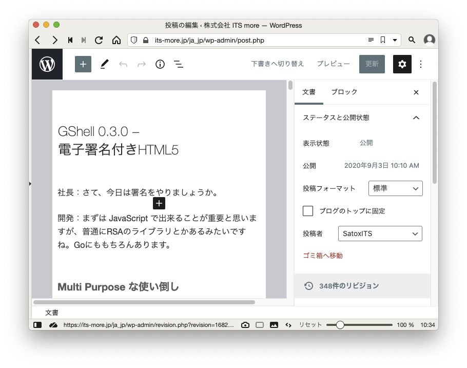 開発:それは「更新」のアクションの前段階に署名機能の実行を入れれば出来るでしょうね。WordPressをいじらなくても、ユーザレベルで、GShellで出来ると思います。