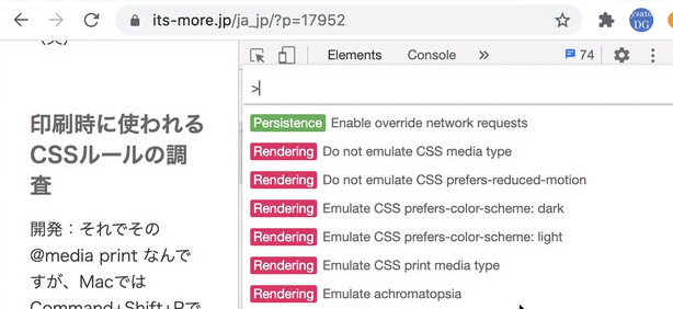 開発:それでその @media print なんですが、Macでは Command+Shift+Pでメニューが出ます。先の記事ではしょっているのですが、これは「開発者ツール」「検証」「インスペクタ」とかの状態でのコマンドです。