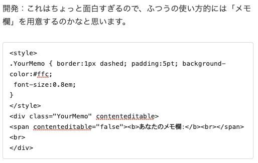 開発:最近知って驚いたHTMLの機能のひとつが contenteditable という属性です。これをつけるだけで、閲覧者が、自分の手元だけであるにしろ、ウェブページを書き換えることができます。
