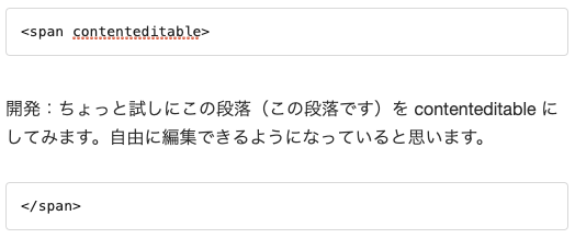 開発:ちょっと試しにこの段落(この段落です)を contenteditable にしてみます。自由に編集できるようになっていると思います。