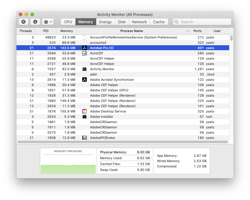 基盤:アクティビティモニタで見ると、なにやらAdobeが編隊飛行してます。
