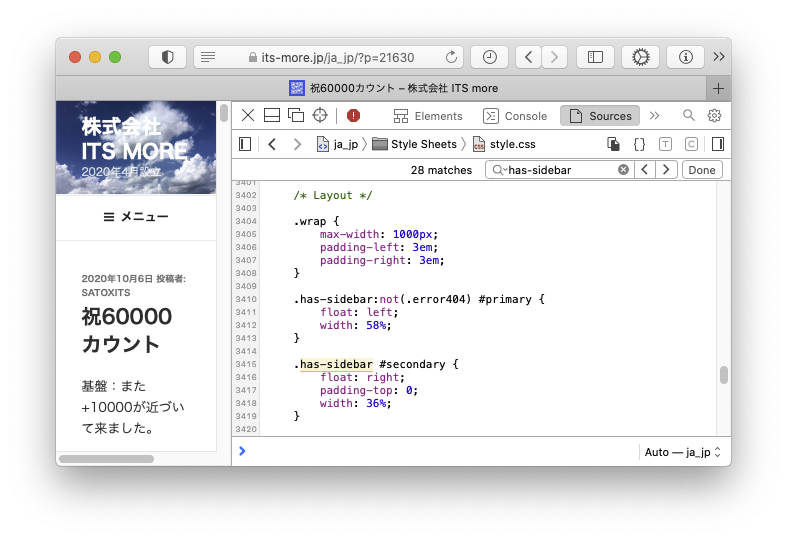 社長:これ、body のクラスから has-sidebar を落としたら、シングルカラムになるんじゃないですかね。