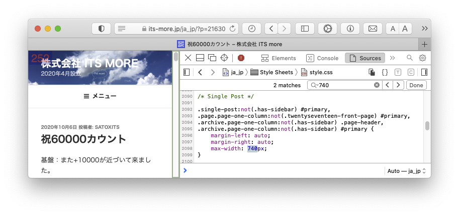開発:この場合の 740px というのは、TwentySeventeenの style.css で、サイドバーが無い場合の投稿記事の表示幅として指定されています。