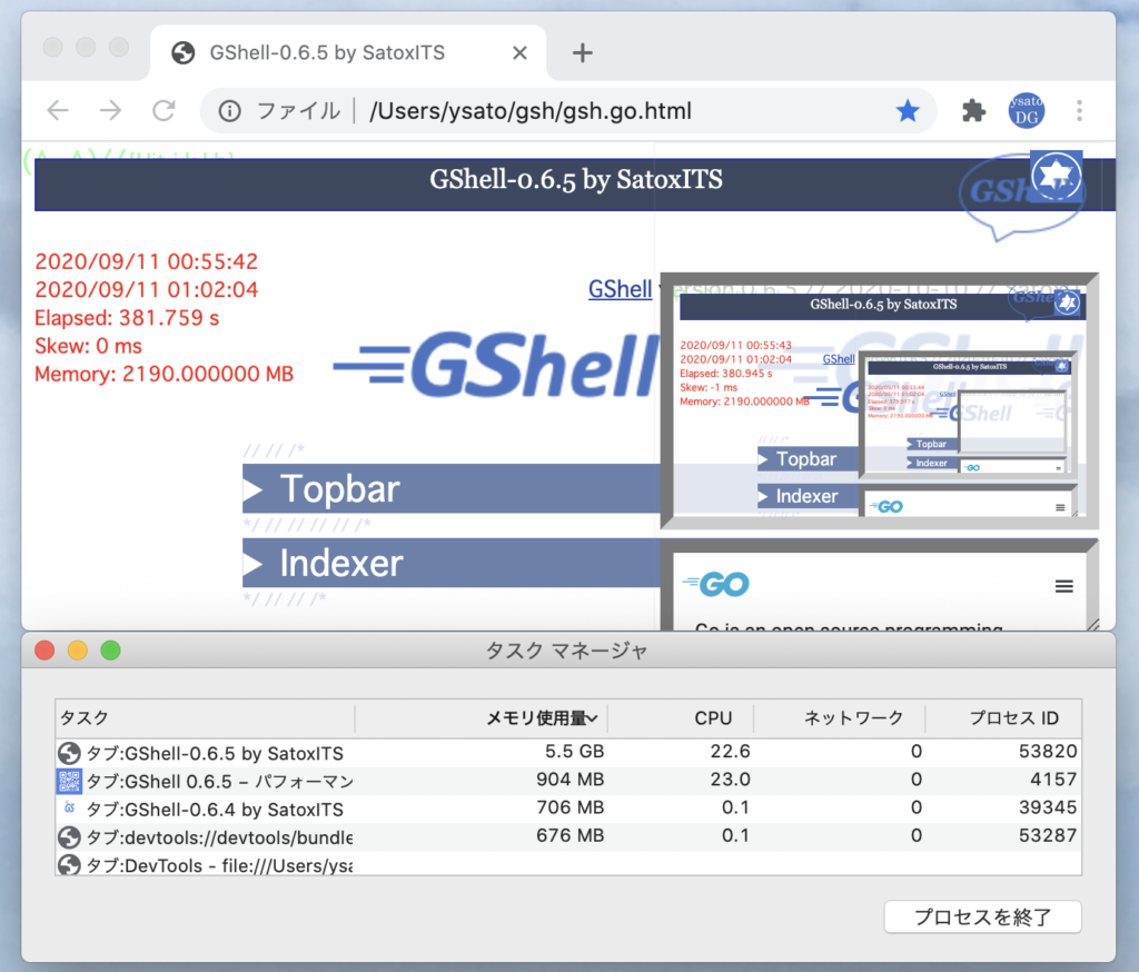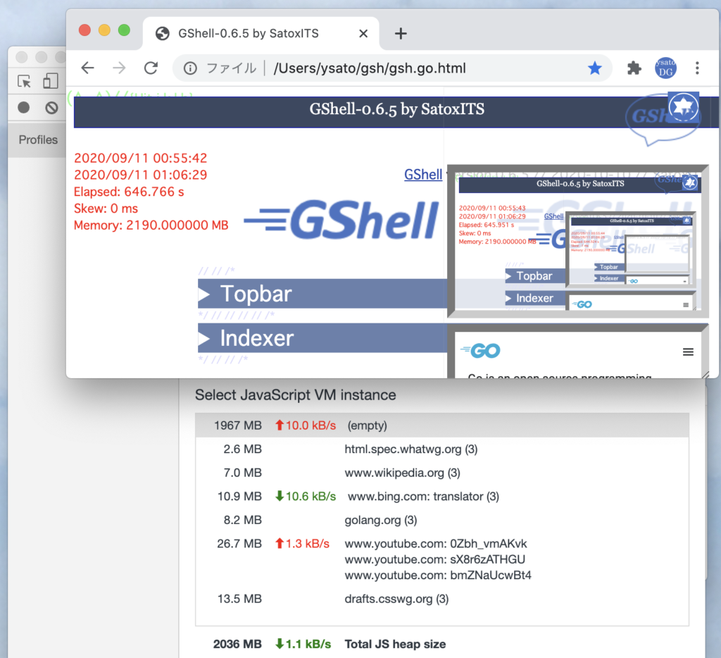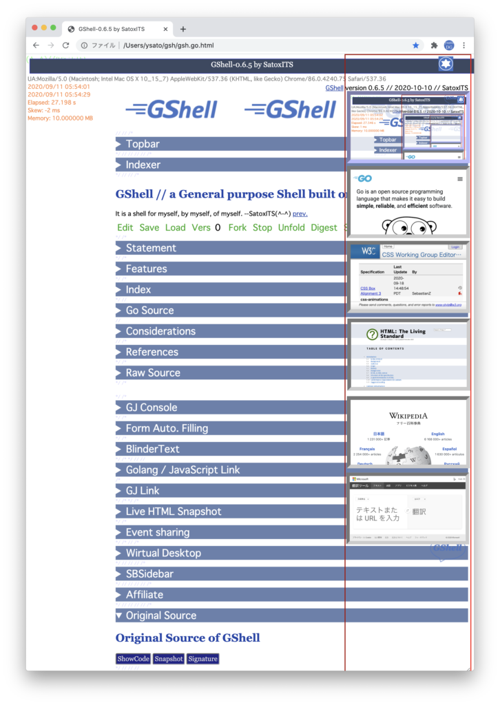This single file "gsh.go", that is executable by Go, contains all of the code written in Go. Also it can be displayed as "gsh.go.html" by browsers. It is a standalone HTML file that works as the viewer of the code of itself, and as the "home page" of this software.