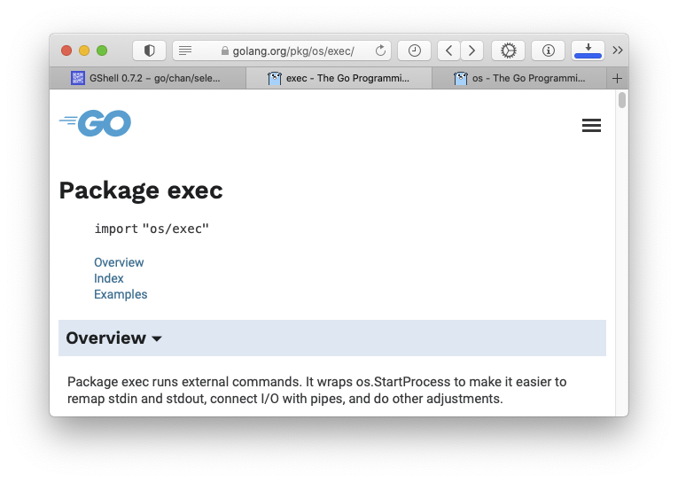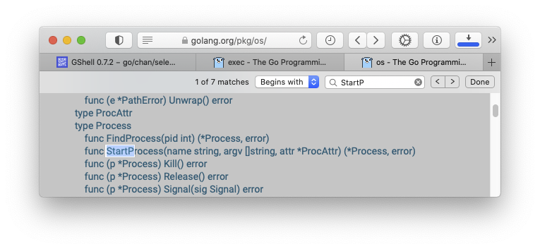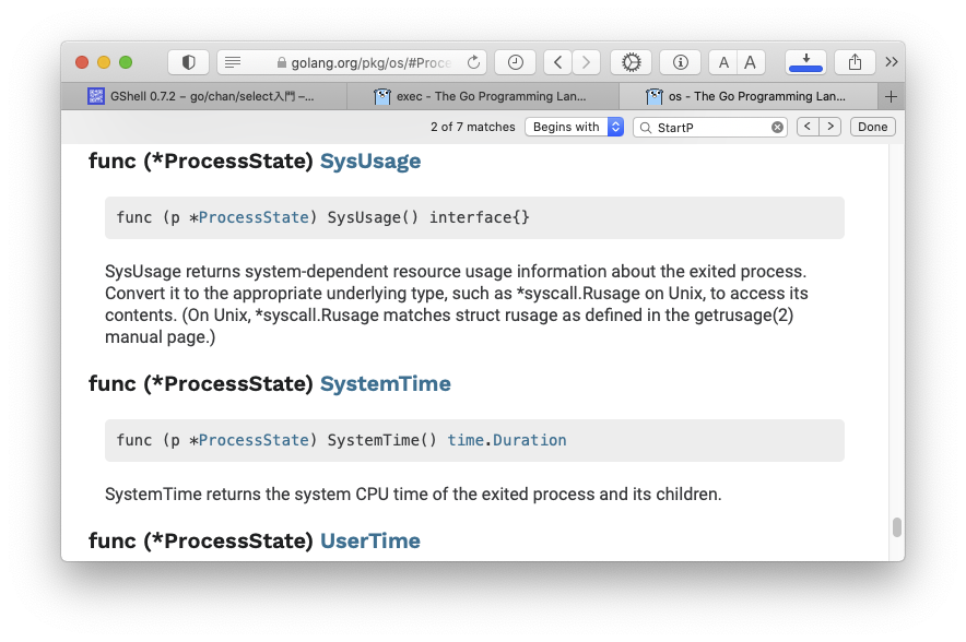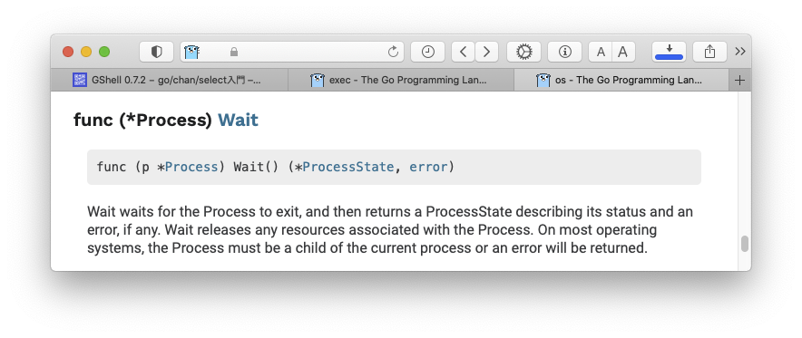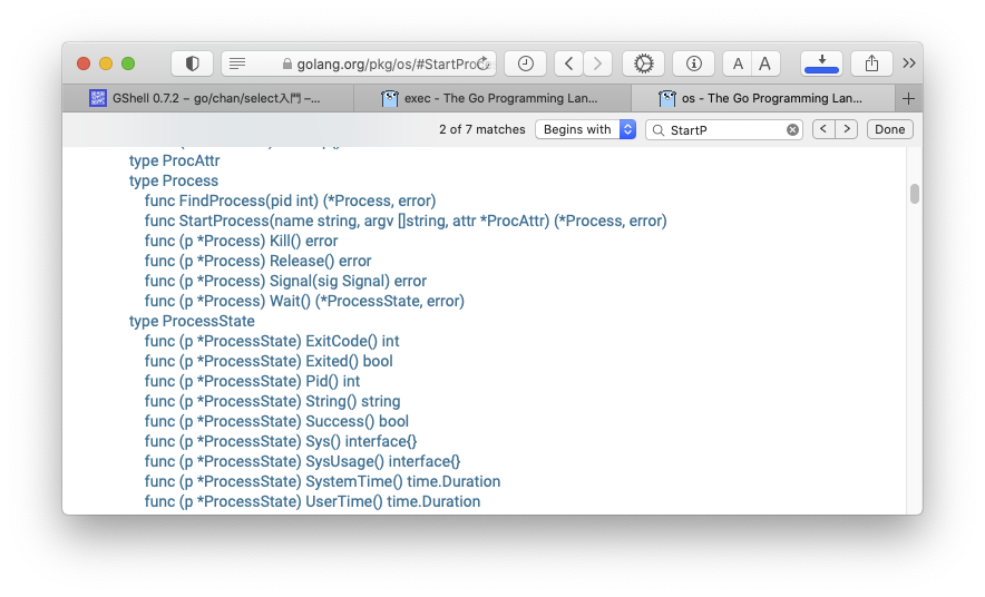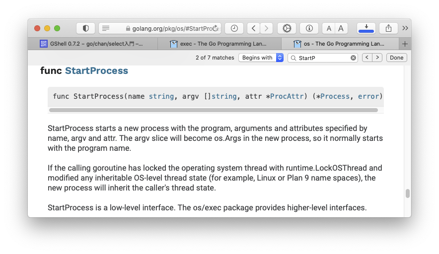 開発:それで今、exec package のドキュメントを見ると、os.StartProcess なる面白げな関数があるらしいとわかりました。