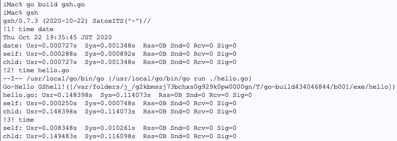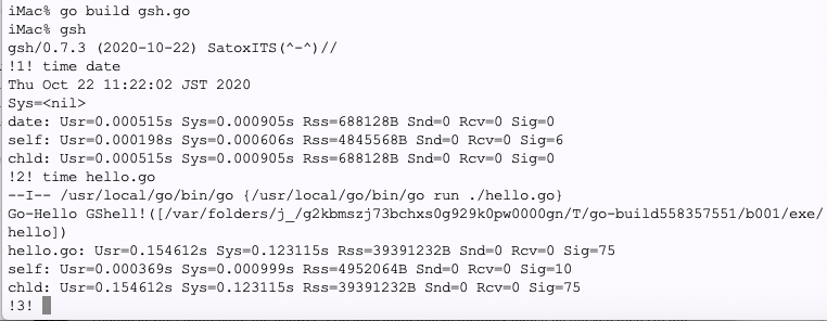 // gsh - Go lang based Shell // (c) 2020 ITS more Co., Ltd. // 2020-0807 created by SatoxITS (sato@its-more.jp) package main // gsh main // Imported packages // Packages import ( "fmt" // fmt "errors" "strings" // strings "strconv" // strconv "sort" // sort "time" // time "bufio" // bufio "io/ioutil" // ioutil "os" // os "syscall" // syscall "plugin" // plugin "net" // net "net/http" // http //"html" // html "path/filepath" // filepath "go/types" // types "go/token" // token "encoding/base64" // base64 "unicode/utf8" // utf8 //"gshdata" // gshell's logo and source code "hash/crc32" // crc32 "golang.org/x/net/websocket" "runtime" ) /* #include // to be closed as HTML tag :-p #ifdef _WIN32 #include // // 2020-1022 added -- terminal mode on Windows // https://docs.microsoft.com/en-us/windows/console/setconsolemode // https://docs.microsoft.com/en-us/windows/win32/inputdev/using-keyboard-input int setTermRaw(){ HANDLE hStdin = GetStdHandle(STD_INPUT_HANDLE); DWORD tmode = 0; if( GetConsoleMode(hStdin,&tmode) ){ DWORD xmode = tmode; xmode &= ~ENABLE_ECHO_INPUT; xmode &= ~ENABLE_LINE_INPUT; xmode |= ENABLE_PROCESSED_INPUT; // Control+C for SIGINT if( SetConsoleMode(hStdin,xmode) ){ return tmode; } } return 0; } int setTermMode(int tmode){ HANDLE hStdin = GetStdHandle(STD_INPUT_HANDLE); SetConsoleMode(hStdin,tmode); return 0; } #else int setTermRaw(){ return -1; } int setTermMode(int tmode){ return 0; } #endif */ import "C" /* // // 2020-0906 added, // // CGo // #include "poll.h" // // to be closed as HTML tag :-p // typedef struct { struct pollfd fdv[8]; } pollFdv; // int pollx(pollFdv *fdv, int nfds, int timeout){ // return poll(fdv->fdv,nfds,timeout); // } import "C" // 2020-1021 replaced poll() with channel/select // // 2020-0906 added, func CFpollIn1(fp*os.File, timeoutUs int)(ready uintptr){ var fdv = C.pollFdv{} var nfds = 1 var timeout = timeoutUs/1000 fdv.fdv[0].fd = C.int(fp.Fd()) fdv.fdv[0].events = C.POLLIN if( 0 < EventRecvFd ){ fdv.fdv[1].fd = C.int(EventRecvFd) fdv.fdv[1].events = C.POLLIN nfds += 1 } r := C.pollx(&fdv,C.int(nfds),C.int(timeout)) if( r <= 0 ){ return 0 } if (int(fdv.fdv[1].revents) & int(C.POLLIN)) != 0 { //fprintf(stderr,"--De-- got Event\n"); return uintptr(EventFdOffset + fdv.fdv[1].fd) } if (int(fdv.fdv[0].revents) & int(C.POLLIN)) != 0 { return uintptr(NormalFdOffset + fdv.fdv[0].fd) } return 0 } */ const ( NAME = "gsh" VERSION = "0.7.3" DATE = "2020-10-22" AUTHOR = "SatoxITS(^-^)//" ) var ( GSH_HOME = ".gsh" // under home directory GSH_PORT = 9999 MaxStreamSize = int64(128*1024*1024*1024) // 128GiB is too large? PROMPT = "> " LINESIZE = (8*1024) PATHSEP = ":" // should be ";" in Windows DIRSEP = "/" // canbe \ in Windows OnWindows = false; ) func initGshEnv(){ if( runtime.GOOS == "windows" ){ PATHSEP = ";"; DIRSEP = "\\"; OnWindows = true; }else{ } } // -xX logging control // --A-- all // --I-- info. // --D-- debug // --T-- time and resource usage // --W-- warning // --E-- error // --F-- fatal error // --Xn- network // Structures // 2020-1022 Unix/Windows // ---------------------- //type aStat_t syscall.Stat_t; //type aStat_t struct { syscall.Stat_t } type aStat_t struct { Size int64 Mode os.FileMode Rdev int64 Blocks int64 Nlink int64 } func aLstat(path string, astat *aStat_t)(error){ /* sstat := syscall.Stat_t{}; err := syscall.Lstat(path,&sstat); *astat = aStat_t(sstat); */ fi,err := os.Stat(path); if( err == nil ){ astat.Mode = fi.Mode(); astat.Size = fi.Size(); } return err; } func aFstat(fd int, astat *aStat_t)(error){ /* sstat := syscall.Stat_t{}; err := syscall.Fstat(fd,&sstat); *astat = aStat_t(sstat); */ err := errors.New("NotImplemented-Fstat"); //fmt.Printf("---E-- fstat(%v)(%v)\n",fd,err); return err; } func aAccess(path string, mode uint32)(error){ //err := syscall.Access(path,mode); //err := errors.New("NotImplemented-Access"); fi,err := os.Stat(path) //fmt.Printf("-- Access(%v,%v)\n(%v)\n",path,mode,err); if( err == nil ){ fmode := fi.Mode(); if( fmode.IsRegular() ){ perm := fmode.Perm(); if( (uint32(perm) & mode) != 0 ){ return nil; } return errors.New("NotAccessible"); } return errors.New("NotRegularFile"); } return err; } // 2020-1022 Unix/Windows // ---------------------- type aRusage struct { syscall.Rusage Utime time.Duration Stime time.Duration //Sys interface{} } /* const aRUSAGE_SELF = syscall.RUSAGE_SELF const aRUSAGE_CHILDREN = syscall.RUSAGE_CHILDREN */ const aRUSAGE_SELF = 0 const aRUSAGE_CHILDREN = 1 func aGetrusage(sel int, ru *aRusage){ /* sysru := syscall.Rusage{}; syscall.Getrusage(sel,&sysru); ru.Utime = time.Duration(int64(sysru.Utime.Sec)*1000000000+int64(sysru.Utime.Usec)*1000); ru.Stime = time.Duration(int64(sysru.Stime.Sec)*1000000000+int64(sysru.Stime.Usec)*1000); */ } func aSetrusage(ru *aRusage, ps *os.ProcessState){ ru.Utime = ps.UserTime(); ru.Stime = ps.SystemTime(); } func showRusage(what string,argv []string, ru *aRusage){ fmt.Printf("%s: ",what); //fmt.Printf("Usr=%d.%06ds",ru.Utime.Sec,ru.Utime.Usec) //fmt.Printf(" Sys=%d.%06ds",ru.Stime.Sec,ru.Stime.Usec) fmt.Printf("Usr=%d.%06ds ",ru.Utime/1000000000,(ru.Utime/1000)%1000000); fmt.Printf(" Sys=%d.%06ds ",ru.Stime/1000000000,(ru.Stime/1000)%1000000); /* fmt.Printf(" Rss=%vB",ru.Maxrss) if isin("-l",argv) { fmt.Printf(" MinFlt=%v",ru.Minflt) fmt.Printf(" MajFlt=%v",ru.Majflt) fmt.Printf(" IxRSS=%vB",ru.Ixrss) fmt.Printf(" IdRSS=%vB",ru.Idrss) fmt.Printf(" Nswap=%vB",ru.Nswap) fmt.Printf(" Read=%v",ru.Inblock) fmt.Printf(" Write=%v",ru.Oublock) } fmt.Printf(" Snd=%v",ru.Msgsnd) fmt.Printf(" Rcv=%v",ru.Msgrcv) //if isin("-l",argv) { fmt.Printf(" Sig=%v",ru.Nsignals) //} */ fmt.Printf("\n"); } type GCommandHistory struct { StartAt time.Time // command line execution started at EndAt time.Time // command line execution ended at ResCode int // exit code of (external command) CmdError error // error string OutData *os.File // output of the command FoundFile []string // output - result of ufind Rusagev [2]aRusage // Resource consumption, CPU time or so CmdId int // 