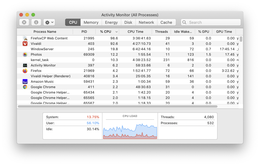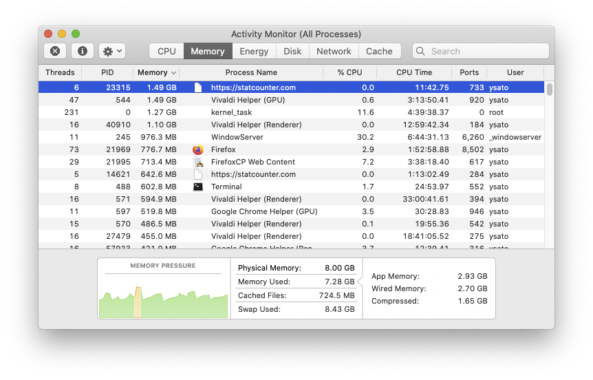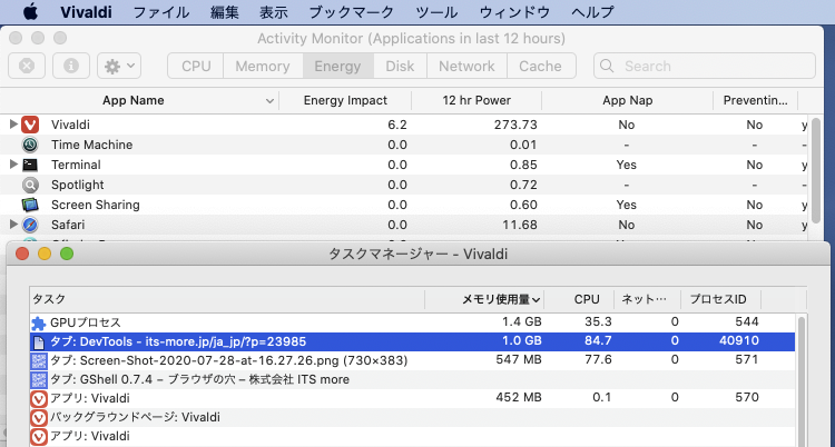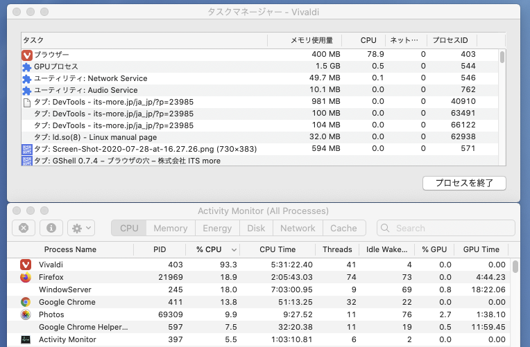 基盤:で、Vivaldiで暴走してたウィンドウのプロセスを停めたせいか、こんどは親玉的なブラウザーというプロセスが爆走をしています。