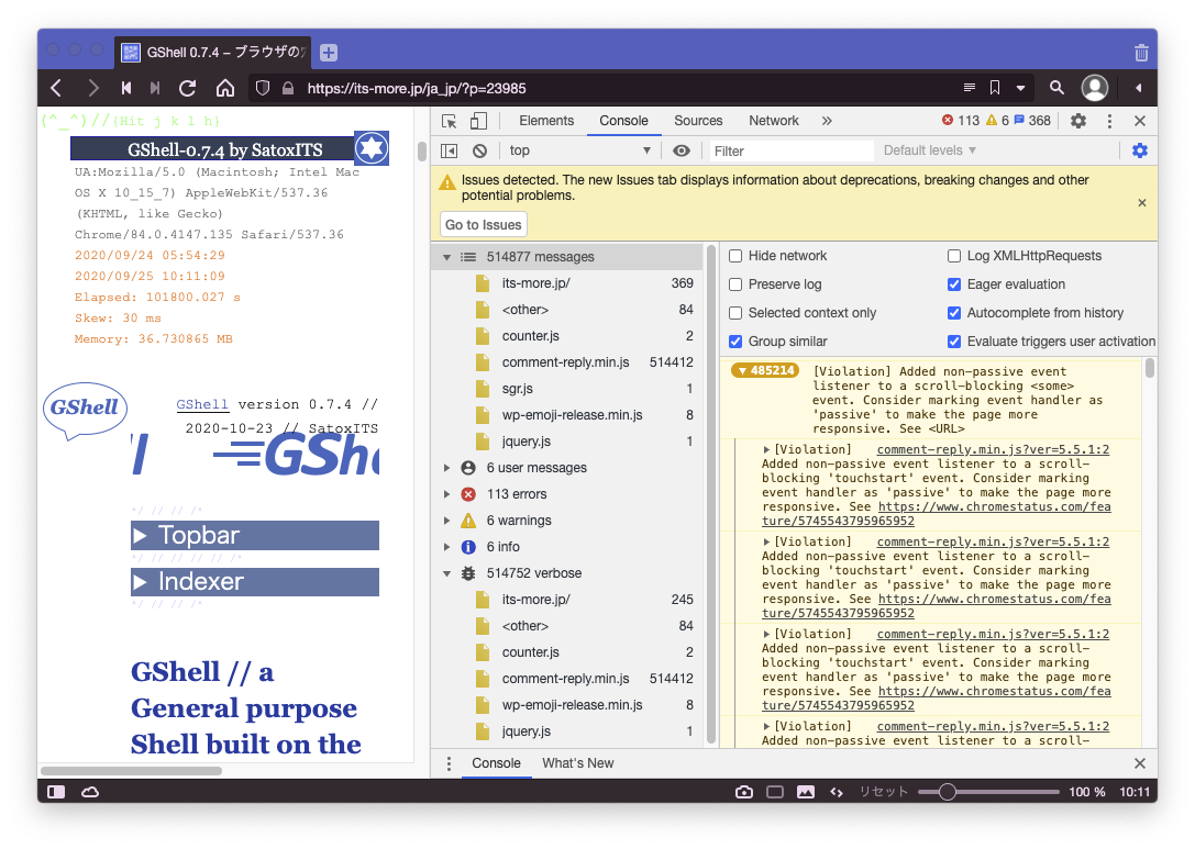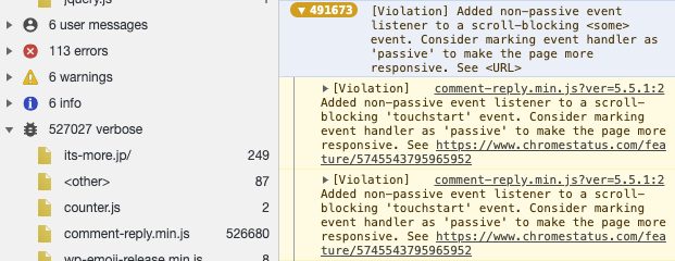 開発:別件でもありましたが、この passive がらみの event listener の問題は Vivaldi にだけ発生しますね。他の Chromium 系では起こらない。独自系の Firefox でも Safari でも起こらないのは不思議では無いですが。
