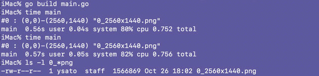 基盤:go get github.com/kbinani/screenshot。main.go をコピペして、go build main.go。time main。・・・うーん、macOS で 2560x1440 で0.7秒ってとこですね。