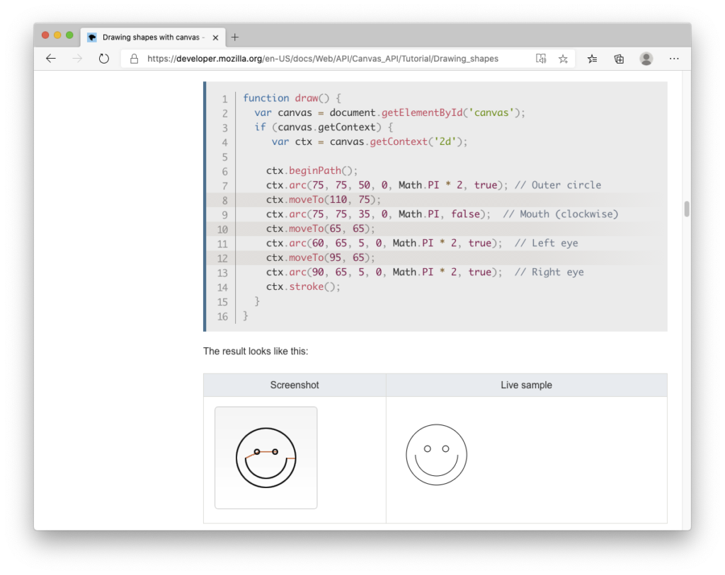 開発:MDN の Canvas の使い方例がまさにスマイルマークの描画になってます。超簡単。