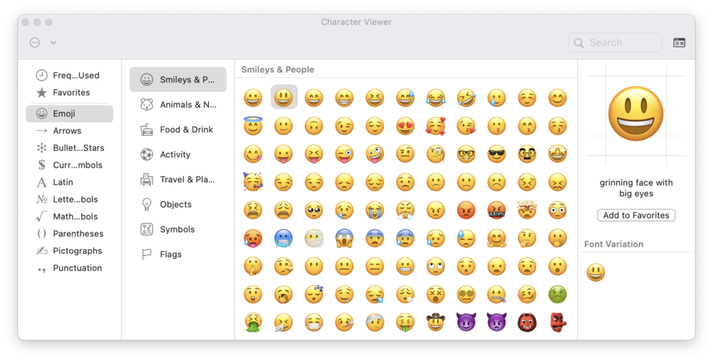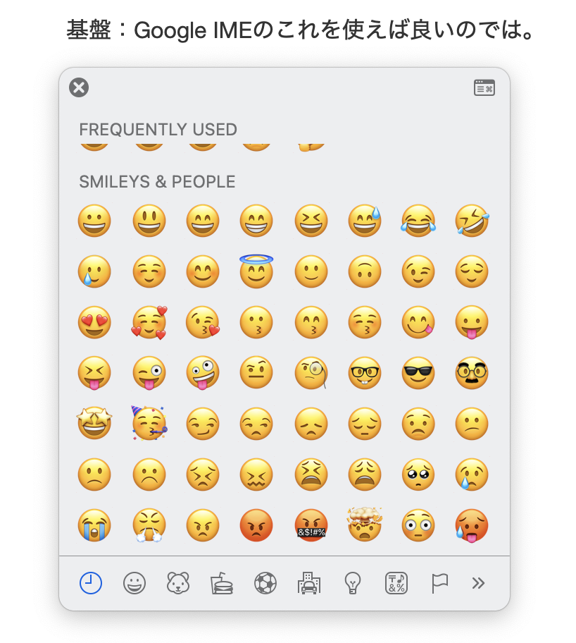 基盤:MacOSではcontrol+command+SPACEで呼び出せてカーソル移動で選べるようですけど。
