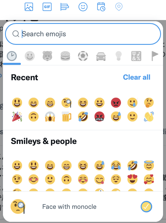 開発:ツイッターの絵文字選択画面は候補の表示が小さくてちょっと不便な感じはします🧐。Google IMEのにしてもそうですが。画面の小さいスマホで入力するのを前提にしてるんですかね。
