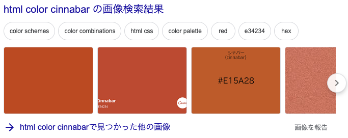 開発:マンセル値とやらで 7.5R 5/14、RGBにすると 217, 66, 54 だそうです。つまりHTML・CSS的には、color=#D94236 ですね。おや?でも cinnabar でググると色んな色が出てきます。