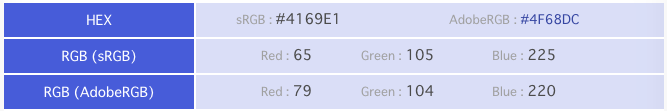 開発:そもそも色の見え方は相対的なので、色の表現には sRGB と AdobeRGB とか、色んな体系があるということのようです。当社イメージカラー候補の Royalblue ではこんな感じです。