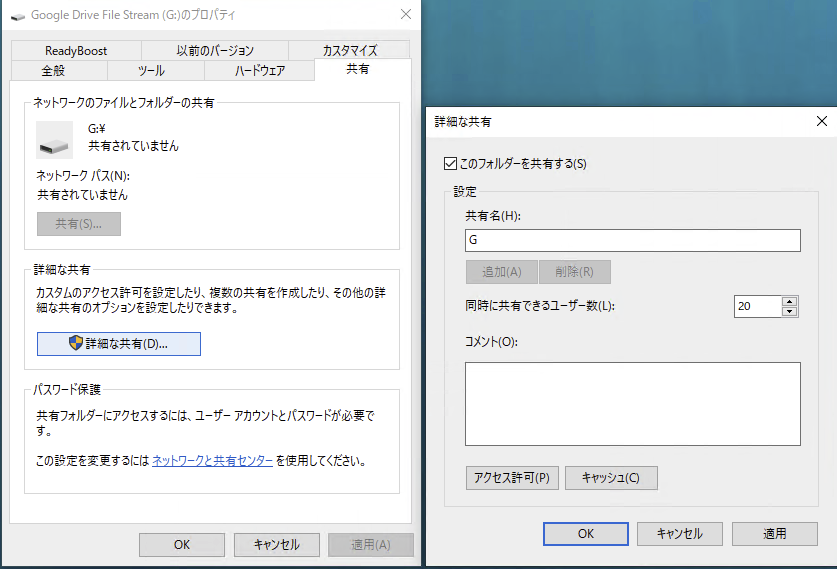 基盤:それではということで、ホストマシン上でマウントしたGoogleDriveをSMBでマウントしてみようかと。まず、WindowsのGドライブにマウントされてるGoogleDriveを共有にします。