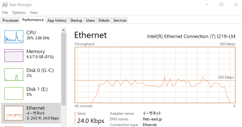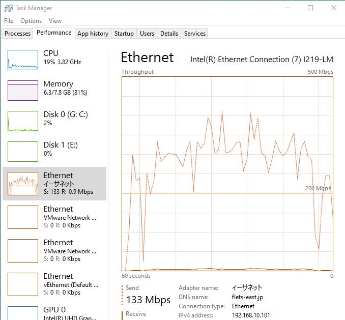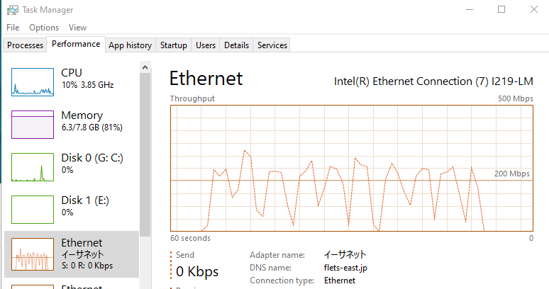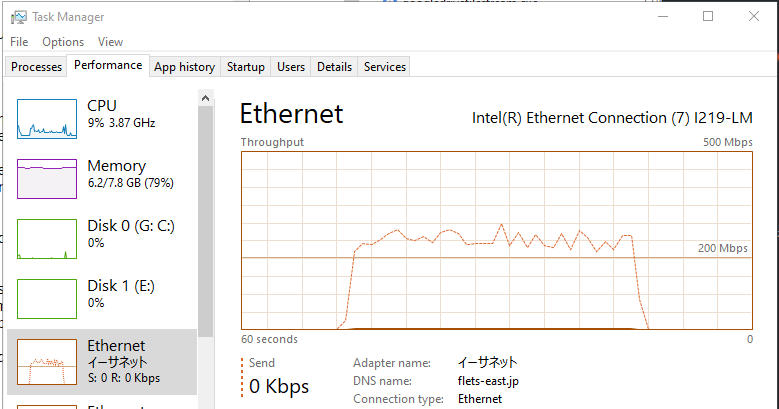 そしてDropbox。ほとんど200Mbpsに達せず、気合が足りない感じ↓