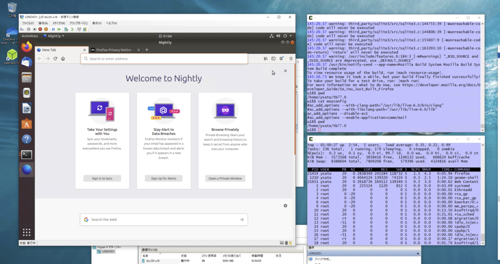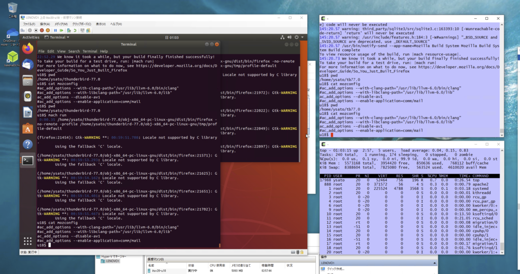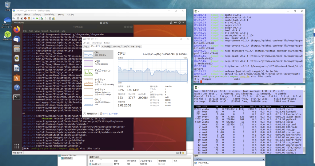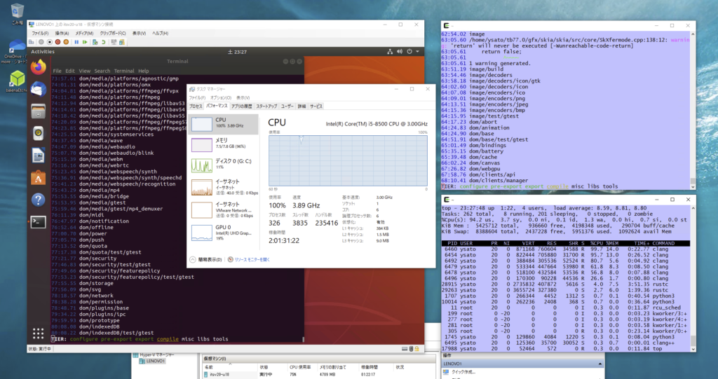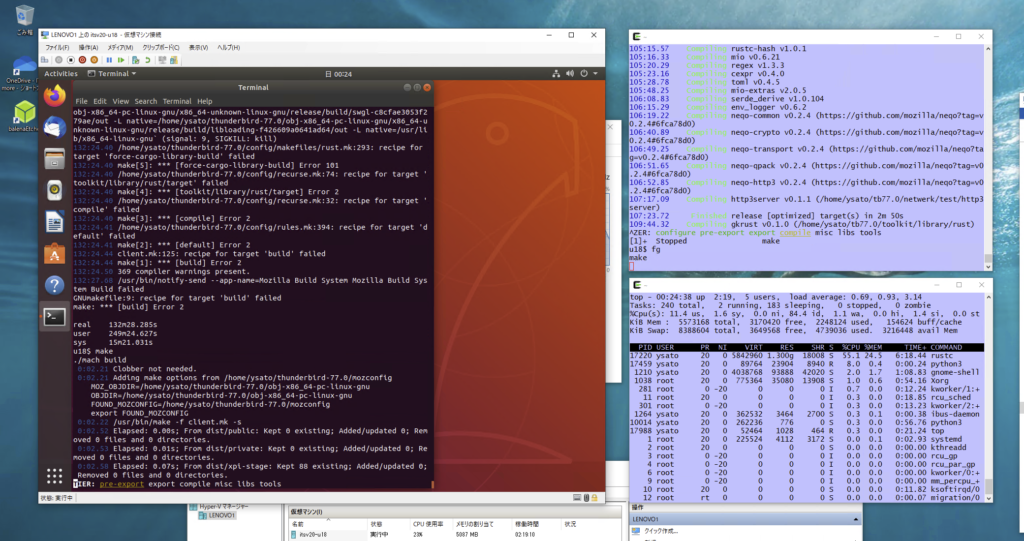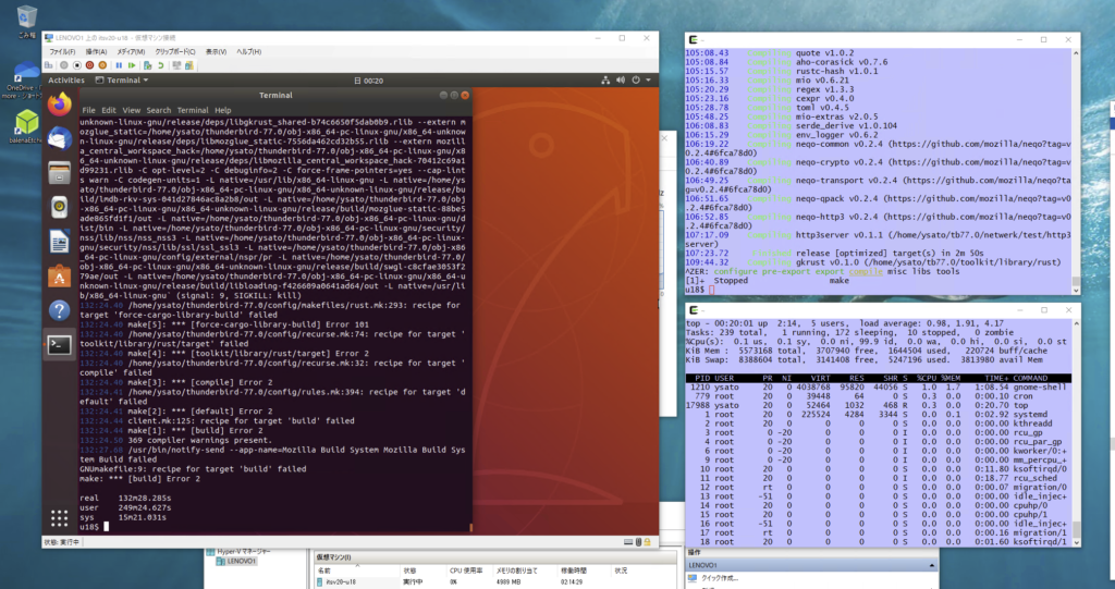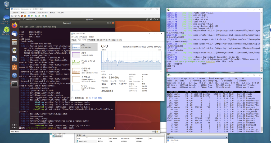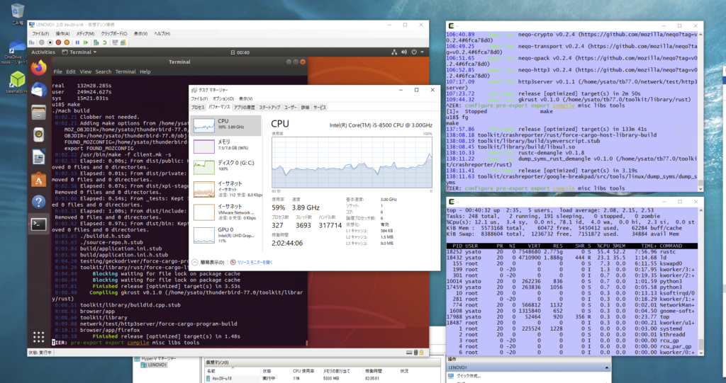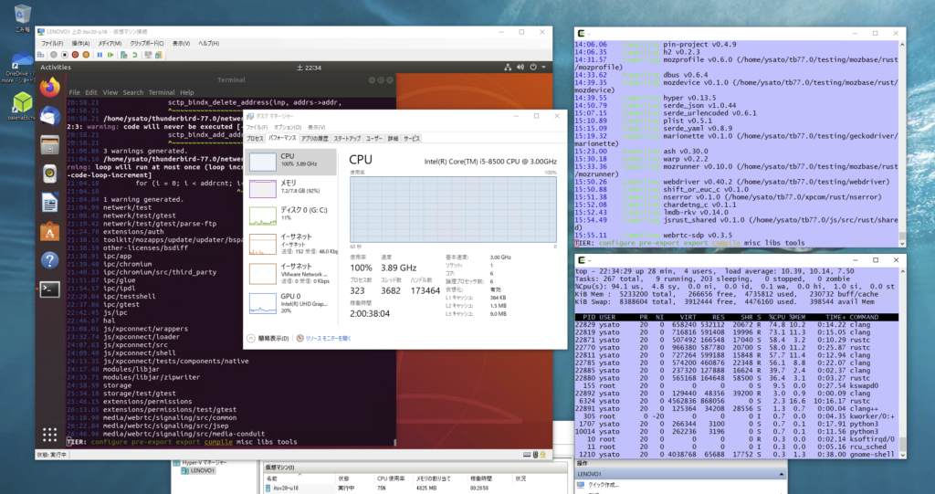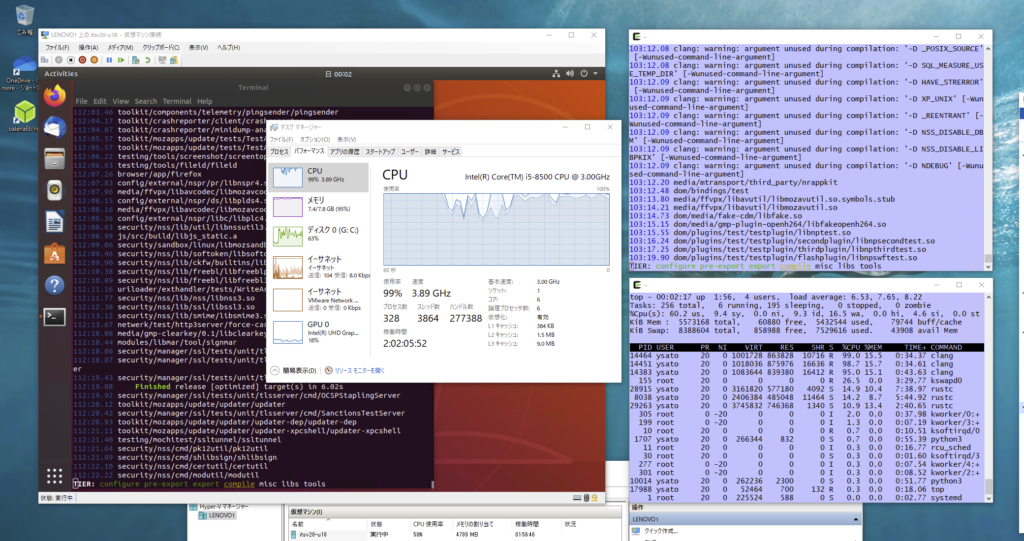 基盤:それで、FirefoxとThunderbirdの77をサラからビルドしてるんですが、面白いので並列にやってます。コアは6つのうちの5つをあげました。ホストの負荷のCPU100%ベタが気持ちいいですね。能力を余す事なく使い切っている。なのに、ホストもゲストも操作にサクサク反応するし、RemoteDesktopも何の問題も無いです。スケジューリング技術のたまものですかね。