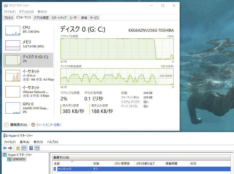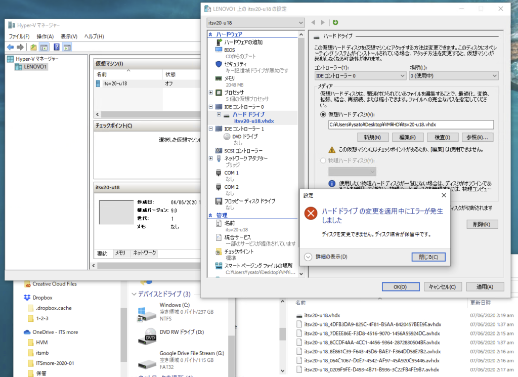 基盤:つまり、バックグラウンドで何かやってます。HVのメッセージに「ディスク結合が保留中です」とありますから、ひょっとしてディスクを空ければ再開してくれるの?と期待しました。それでいらないファイルを見つけてなんとか11GB空けまして(まだゴミがあったのでした)、Hyper/Vをつついてみたところ、なーんと、復活してしまったんです!