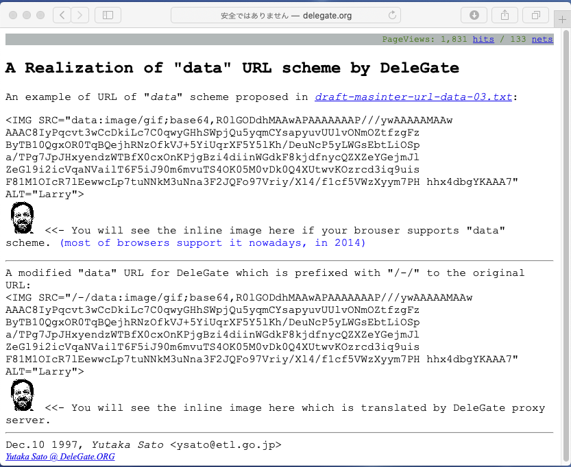 data scheme には実際、特に当時の未成熟なブラウザの状況もあり、色々な応用が期待された。data:表現が提案されたのは1997ねんで、翌1998年に正式にRFC2397となった。私はこれを使って、ブラウザによってサポートされていない文字や画像を埋め込む事を考えた。当時書いたデモ用のページが今も残っている(というか、動態保存している 笑)
