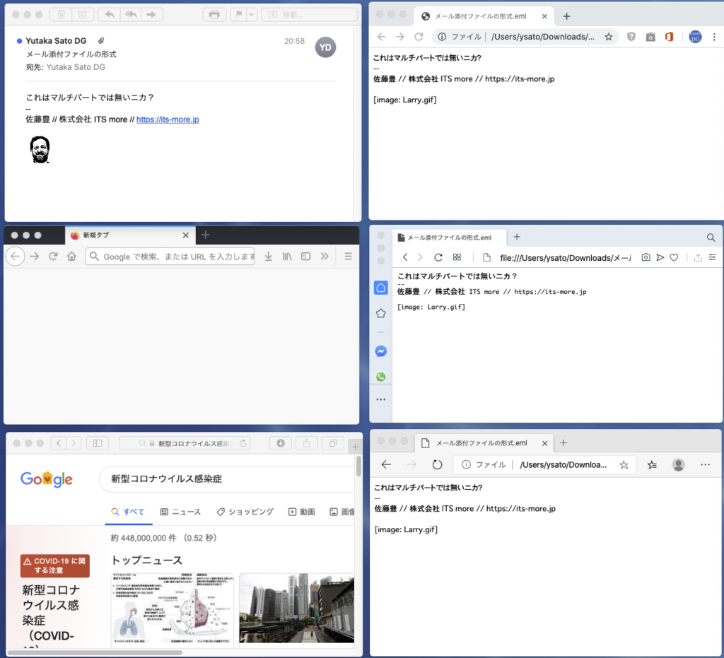 さて。それでは、昨今のウェブブラウザは、URLとしてのdata:multipart ではなく、HTTPのメッセージボディとしては、Content-Type: multipart を処理してくれるのだろうか?と一瞬期待して、試してみた(↓)。メール(左上)のソースをGmailのメッセージダウンロードで .eml に吐いて、ドラッグ&ドロップして各ブラウザに食わせた。結果は残念ながら、きちんと表示してくれるブラウザはなかった。無視または外部のブラウザ(メールツール)にまる投げするのが Firefox と Safari、一応マルチパートを解釈するがプレインテキストだけ表示するのがChrome, Opera, Edge だった。↓