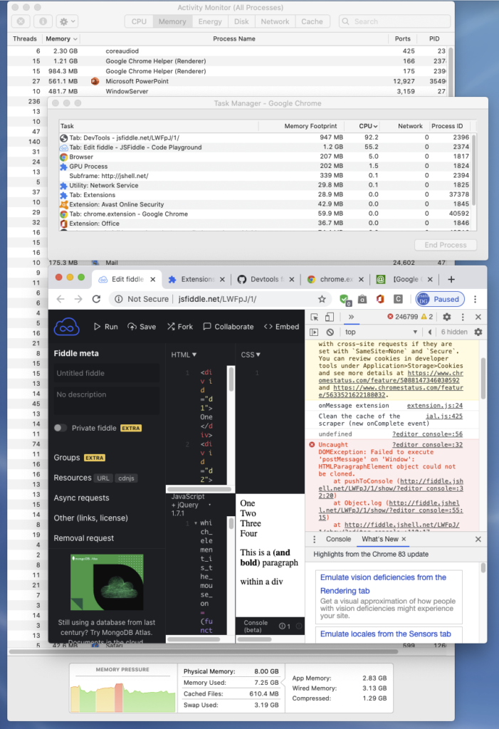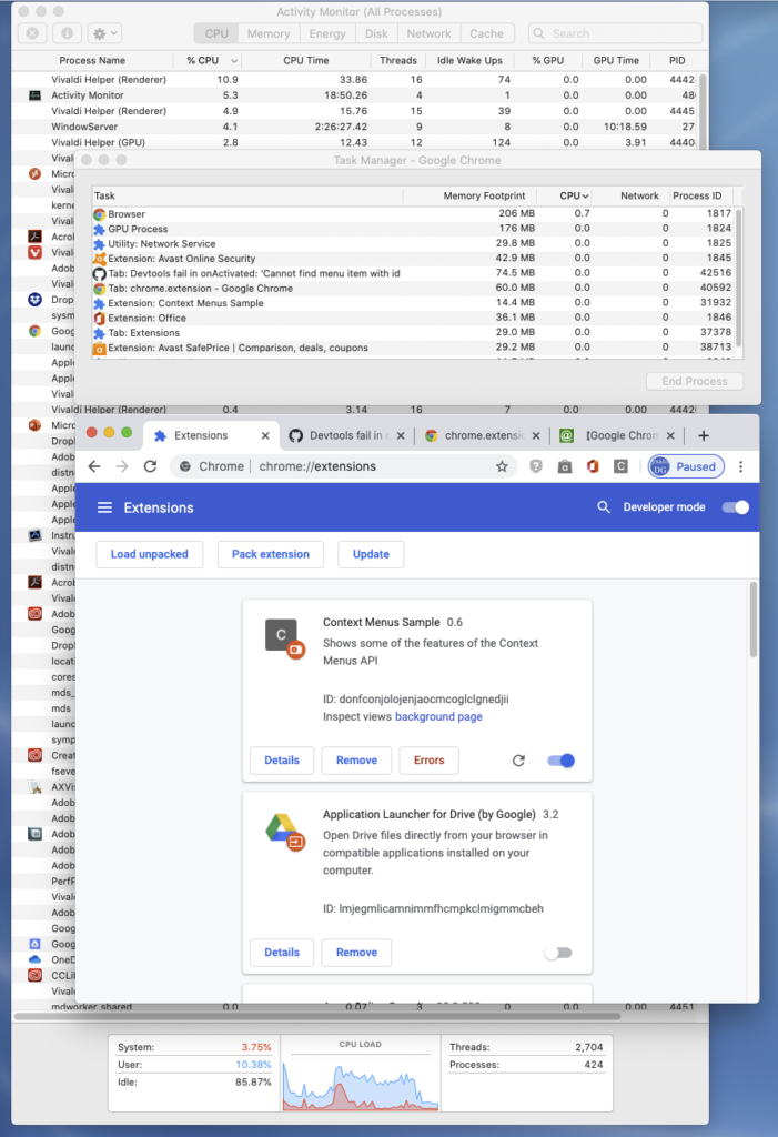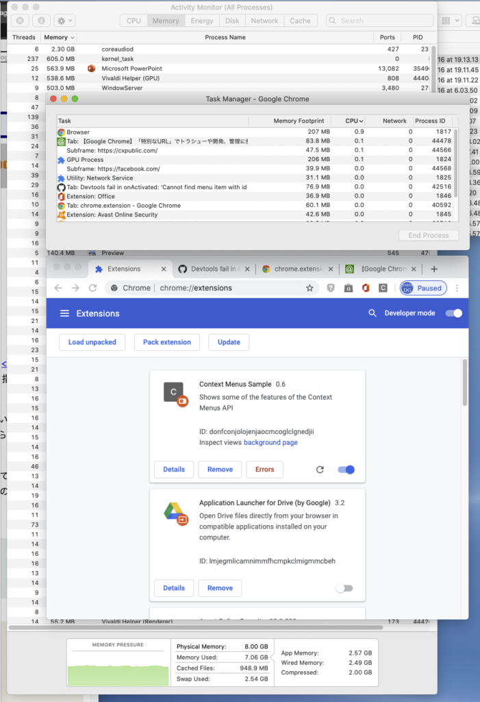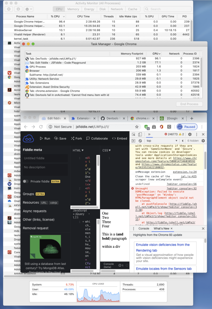 開発:でかくなっちゃったのはメモリがリークしてるからじゃないかなぁ。天下のChromeが?って思うけど。Chromeはやたらメモリを食うといイメージもある。そのタブのプロセスって開いた瞬間からCPU上位に来るけど、Vivaldiで同じURL開いてもそうならないですね。タスクに対するリソースの割り当て方のポリシーの違いとかなのかな?