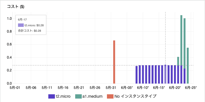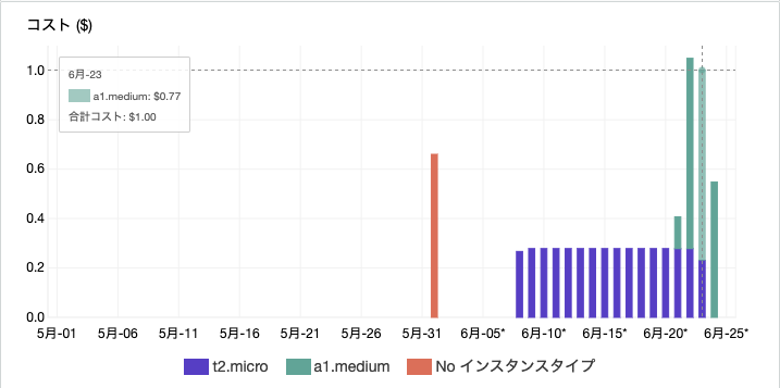 基盤:さてAWS EC2の仮想マシンですが、これまで作った t2.micro (x86_64) Ubuntu 18.04 は $0.28/day、a1.medium(ARM 64bits)Ubuntu 20.04は $0.77/day ということになりました。