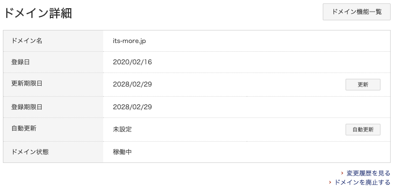 基盤:それをぜひ、ライトセールから活用したいです。あと、実は、これ絶対いらんだろうというドメイン名で試しにドメイン廃止をしてみました。XSOのコンソールメニューから廃止を探すのは難しいですが、個別ドメインを選択してドメイン詳細ページに入ると、そこにひっそりと「>ドメインを廃止する」というリンクがあったんです。いろいろ脅しをかけられたりしますが、淡々と廃止できました。そこには「変更履歴」というリンクもあって、なんだここをみれば時間軸を含めて経緯が全部見られたのかー、と思いました。あの山のようなメールを検索しなくて済むかと思うとほっとします。