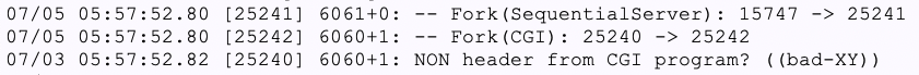 開発:ああ、その文字列はCGIの標準出力に吐いた記憶があります(笑)。なるほど、HTTPヘッダを吐くより前にエラーメッセージを吐いちゃったということか。