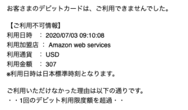 経理:限度額だけの問題ではなくて、$3.07 は払えませんでした、限度額を上げたら、339.00円引き落としました、っていう展開は、わかるけど不連続に感じます。