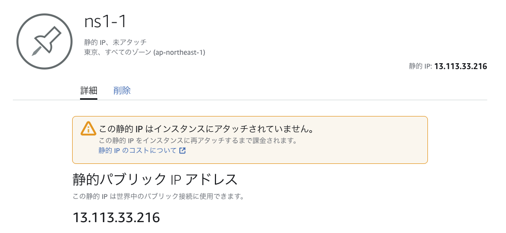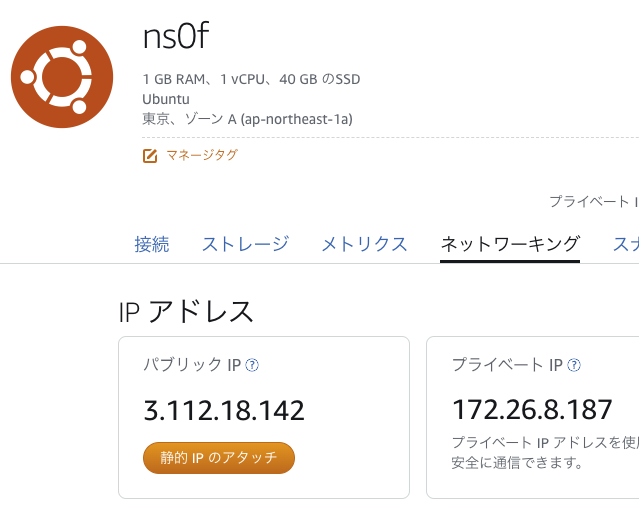 基盤:実はライトセールの使い方を勘違いして、ネームサーバには固定アドレス(パブリックな静的アドレス)を与えていなかったのです。今のネームサーバのインスタンスのネットワーキングはこうなっています。