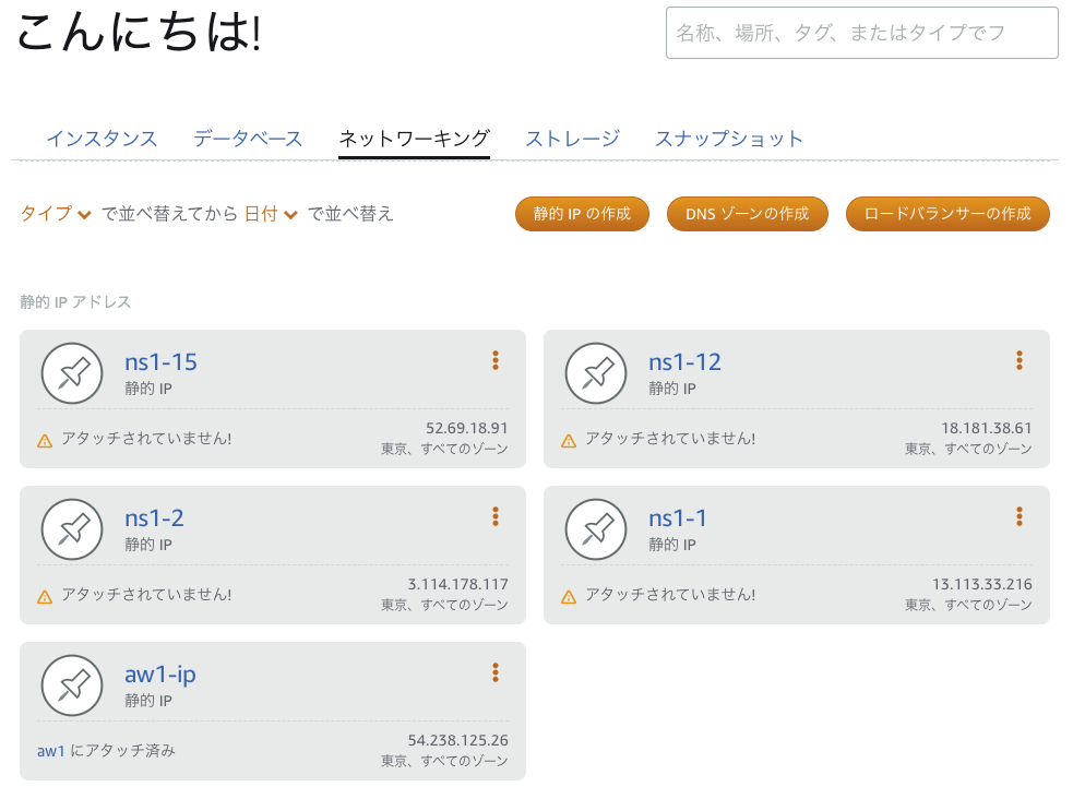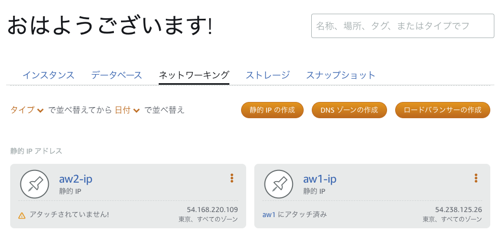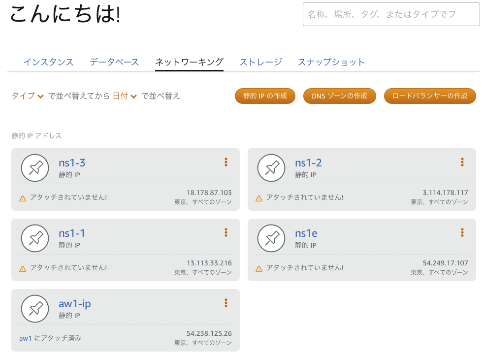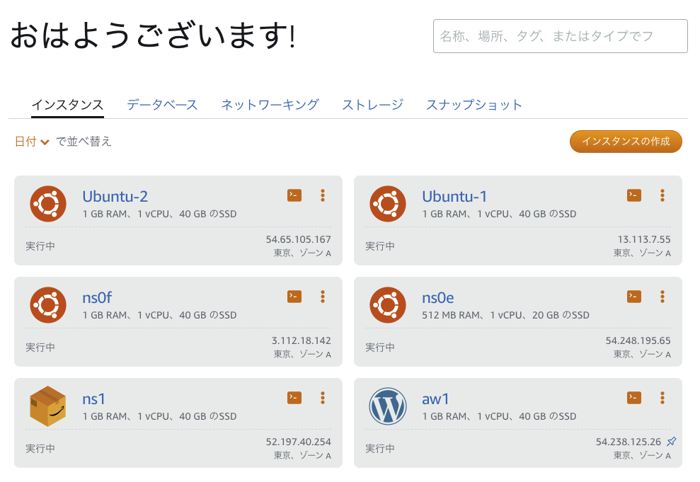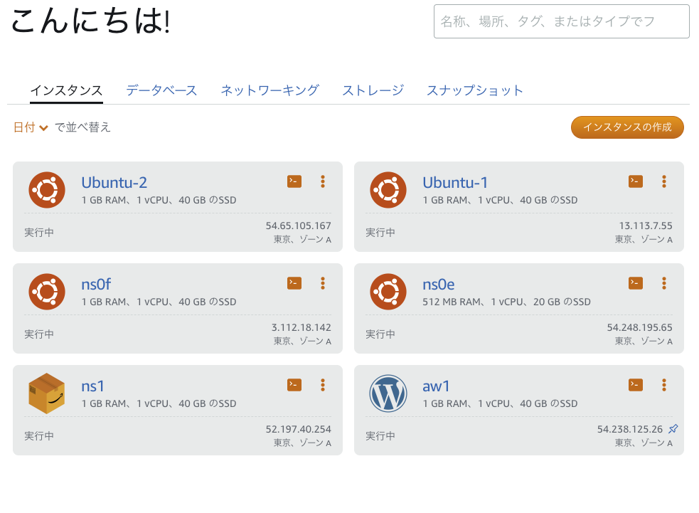 基盤:この 3. ではじまるアドレスは、このインスタンスを作成した時に割り振られたもので、良いアドレスだと思ってこれにしました。ですが「インスタンス生成時に割り振られたアドレスを静的にする」というオプションは、ライトセールには無いのです。勘違いしてしまった理由の一つは、このインスタンスを管理する画面と、全インスタンスを管理するための画面が、なまじ型式が統一されているためです。全体の管理画面(ホーム)はこうなっています。