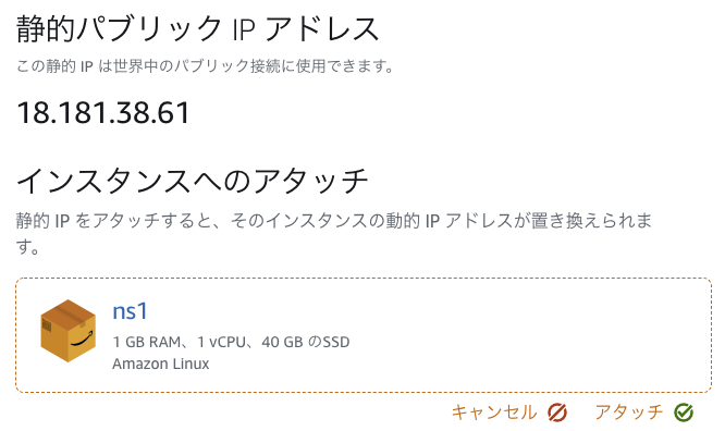 基盤:一つにはネームサーバのアドレスを固定するため、一つにはそれをネームサーバに専用化したいため、一つにはAmazon Linuxを実用に使ってみたいためです。