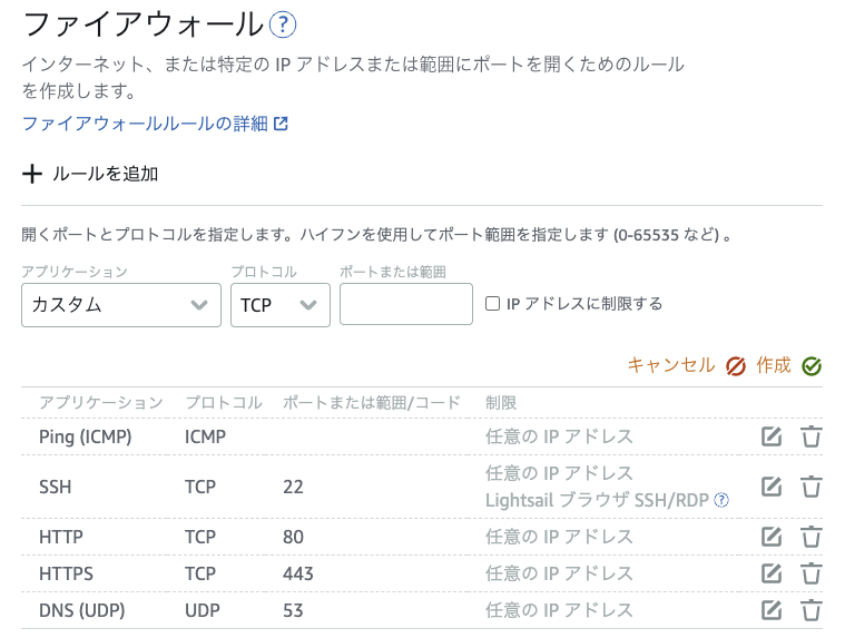基盤:そうか。なんで HTTP は通ったのかな。… ああ、デフォルトで 22 と 80 が開いてるんですね。微妙なデフォルト設定… では 53 も通します。あと443と Ping もかな。うーむお手軽。Azureの10倍以上は簡単ですね。