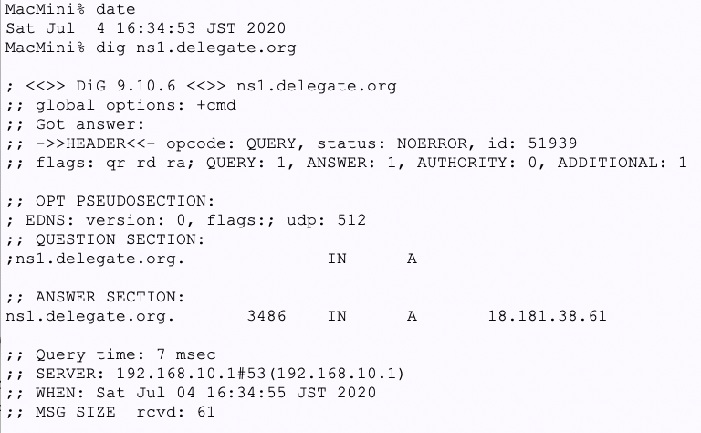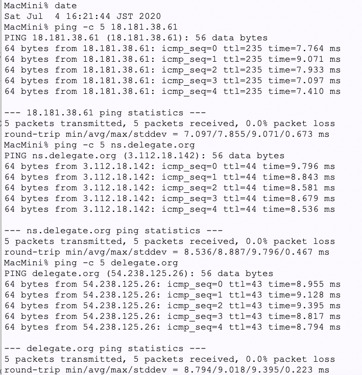 基盤:で再度会社からdig @18.181.38.61 ... OK。ping … OK。うーん、なぜか Ubuntu より若干速いです。