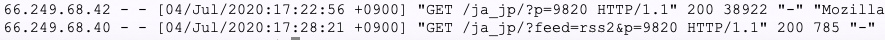 基盤:えーと、googlebot はこの記事(p=9820)に 17:22 と 17:28 に来ていますね。
