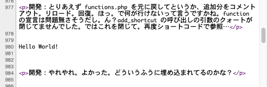 開発:とりあえず functions.php を元に戻してというか、追加分をコメントアウト。リロード。回復。ほっ。で何が行けないって言うですかね。function の宣言は問題無さそうだし。ん?add_shortcut の呼び出しの引数のクォートが閉じてませんでした。ではこれを閉じて。再度ショートコードで参照…