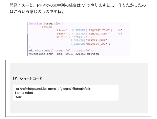 開発:えーと、PHPでの文字列の結合は '.' でやりますと… 作りたかったのはこういう感じのものですね。